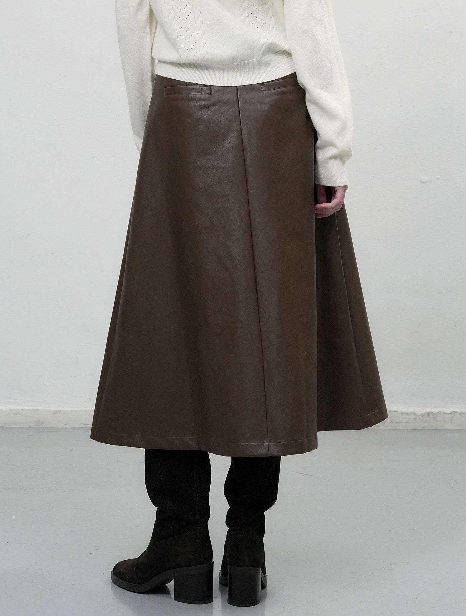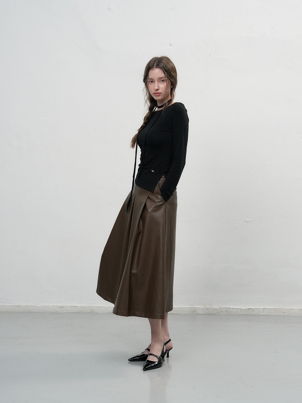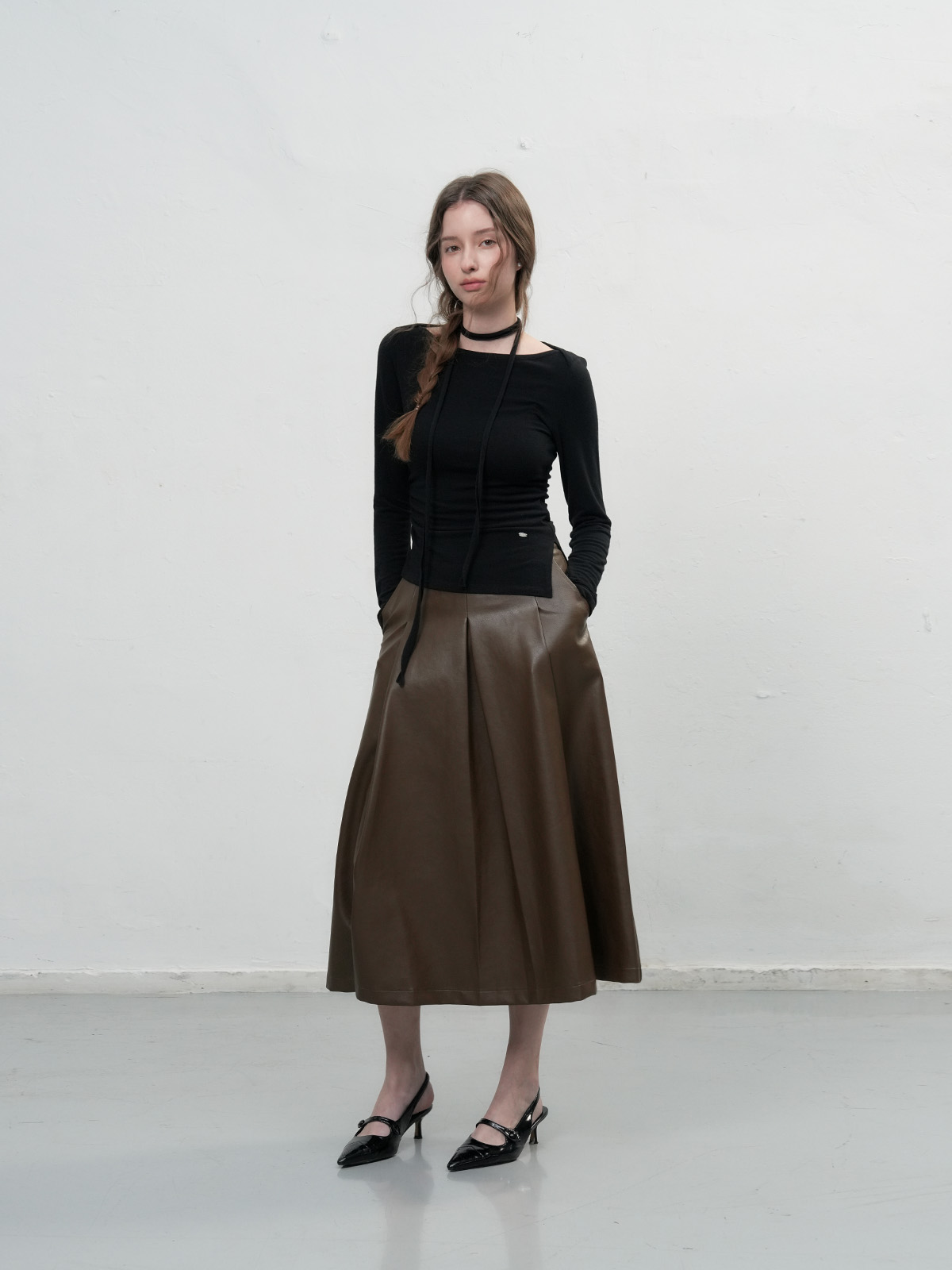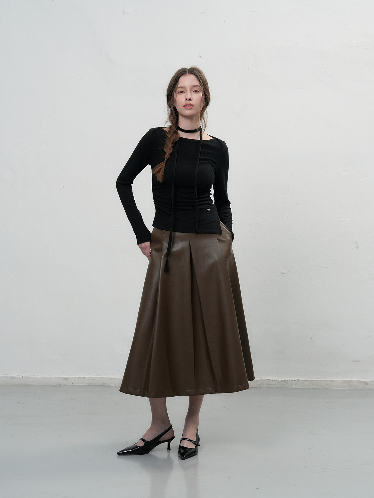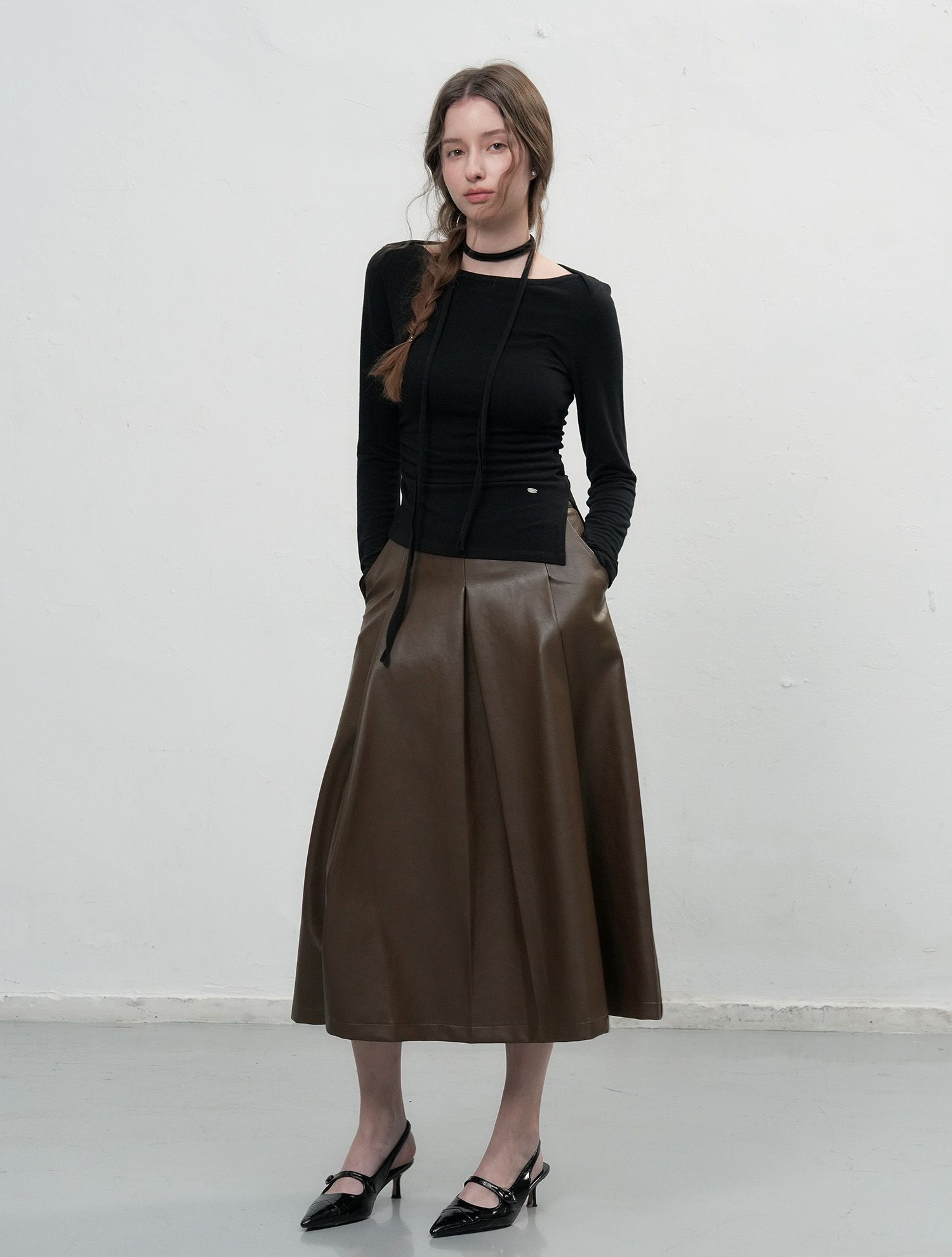 Pleated Fake Leather Long Skirt [BROWN] / WBE3L13501